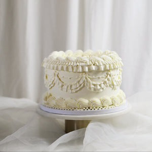This all-white gender reveal cake features vintage-style frilly buttercream for a timeless, elegant look.