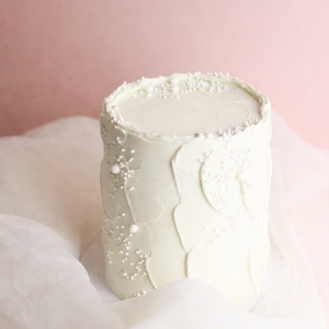 This dreamy all-white cloud cake is covered in soft buttercream and sprinkled with delicate white pearls for a whimsical, airy look.