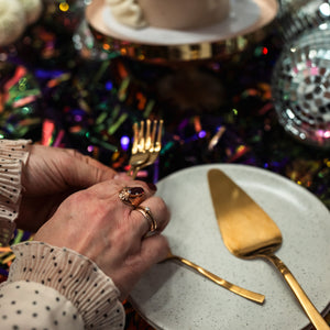 This beauty is decorated with an off-white base, wavy buttercream frills, adorned with golden ornaments (these aren´t edible).