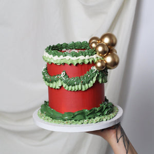 Order either a single-tier cake (all red) or add a bottom-tier to get the full Christmas look on your Christmas party or dinner table!