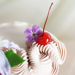 Fall in love with every slice of this Valentine’s cake - fluffy pastel pink buttercream, bright maraschino cherries, and a crown of delicate seasonal flowers.